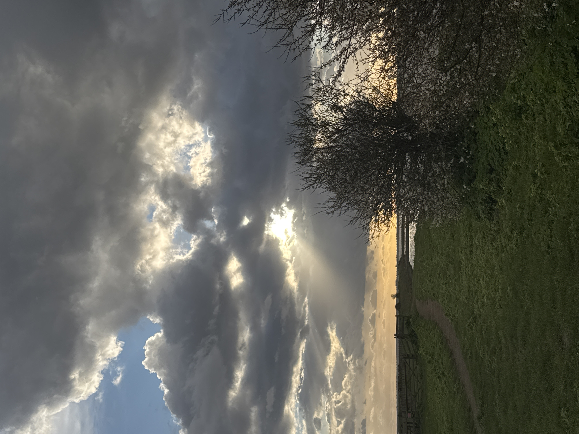 The image depicts a rural waterside landscape, likely bordering the River Yare or an associated broad in the periphery of Great Yarmouth, United Kingdom, during a period of transitioning light. The dominant feature is a dramatic sky with heavy, dark grey clouds interspersed with brighter sections. Several prominent rays of sunlight, consistent with crepuscular rays, pierce through breaks in the cloud cover in the central and upper-right portions, casting a golden hue towards the horizon. In the foreground, on the right, two large, bare-branched deciduous trees or bushes are present, exhibiting small clusters of white blossoms, indicative of late winter or early spring. The lower foreground consists of green grass and low-lying vegetation. A dirt path or track originates from the lower-left, curving towards the mid-ground. To the left of this path, a multi-panel wooden fence and gate structure encloses an area, possibly a field or pasture. Beyond the path and fence, a calm body of water, likely a river or broad, stretches across the mid-ground towards the right, reflecting the ambient light. The distant horizon is flat, characteristic of the local topography, with faint, dark silhouettes of land or structures. No individuals, animals, or specific actions are discernible within the frame.