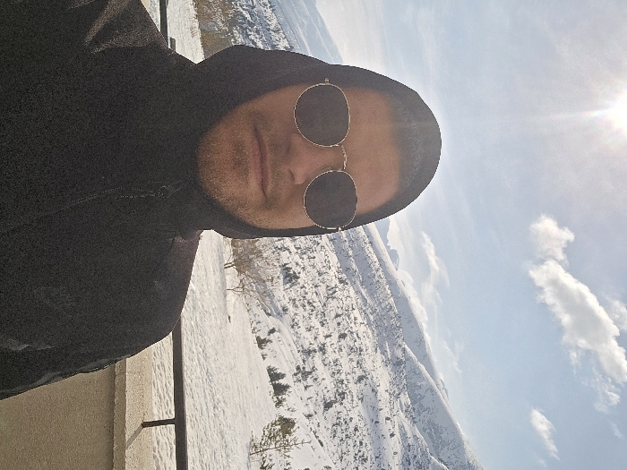 A single adult male is centered in a self-portrait, captured outdoors in a snowy mountainous environment in Panichishte, Bulgaria