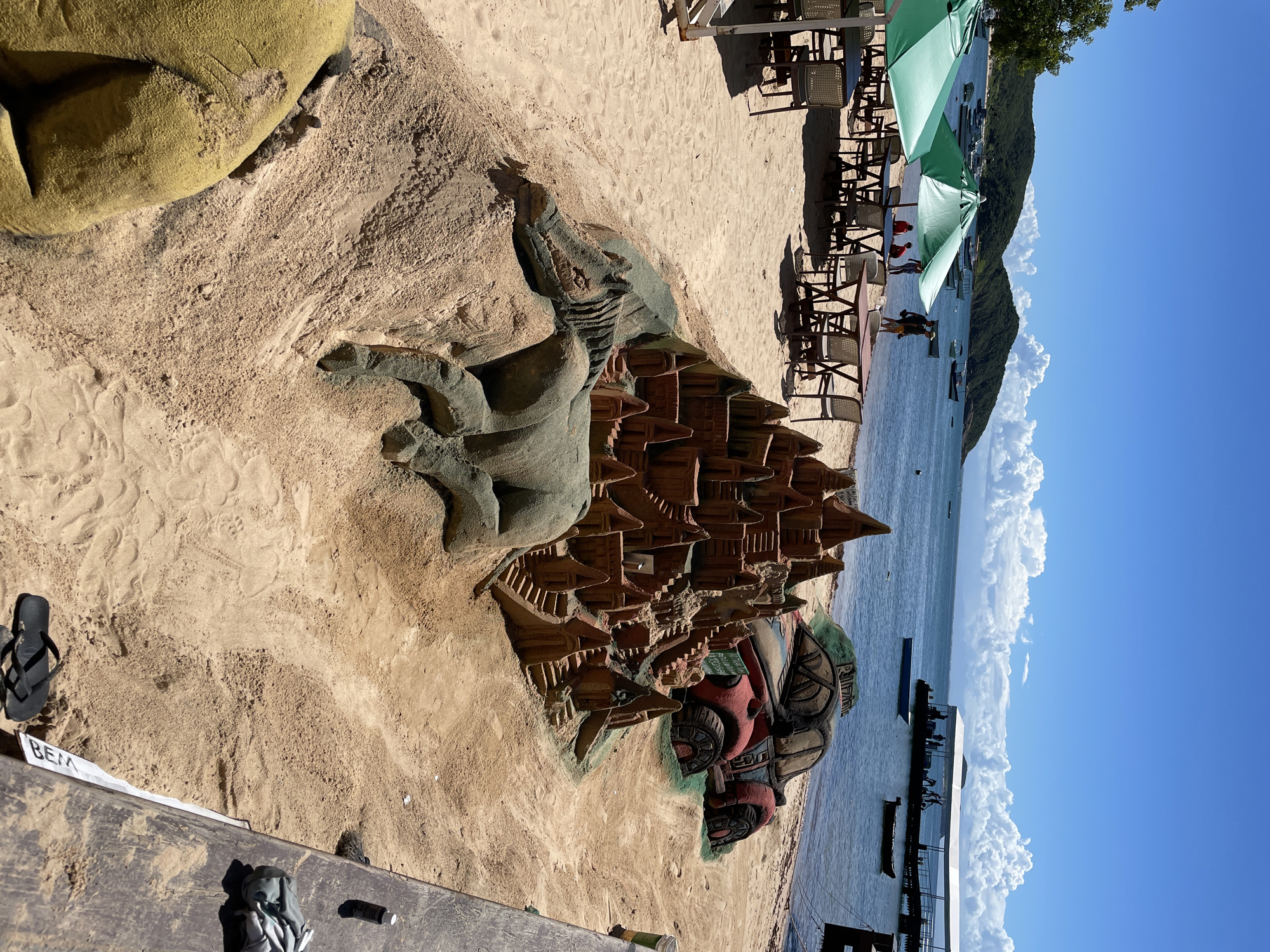 sand sculpture on a beach in Armação Dos Búzios, Brazil. The sculpture features a dragon, a multi-tiered building, and a red car at the bottom. The beach is sandy and there are tables and chairs under green umbrellas nearby. In the background is the ocean and a coastline with a mountain. The sky is blue with some clouds. A pair of sandals is also visible in the foreground on a wooden surface.