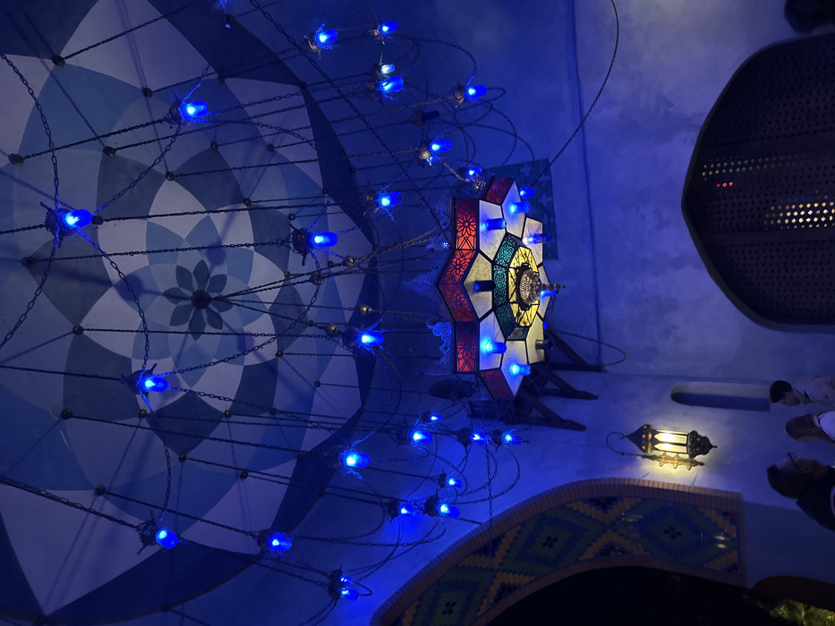 The image depicts an intricately decorated interior scene at Disneyland Paris in Chessy, France, specifically within a themed area such as Adventureland's Agrabah Café or Le Passage Enchanté d'Aladdin. The environment is bathed in a predominant cool blue light. The ceiling features a vaulted or domed structure painted with a geometric pattern in shades of blue and white, radiating from a central floral or star motif. Numerous small, blue-glowing lights, resembling small lanterns or flames, are suspended by chains from the ceiling. A large, ornate, star-shaped chandelier hangs centrally, constructed with multi-colored glass panels (red, green, yellow, blue) and intricate metalwork. This chandelier emits both warm yellow light from its core and blue light from its perimeter, mirroring the ceiling lights. The walls are textured and painted in a muted blue-purple hue. On the left, an arched passageway is visible, its inner arch adorned with a geometric diamond pattern in green, yellow, and white on a dark background. Below it, an ornate wall-mounted lantern with a warm yellow glow is affixed to the wall. On the right, another arched architectural feature, possibly a dark carved panel or shuttered window, is present. Three individuals are partially visible at the bottom of the frame, seen from behind or in profile. One person wears glasses and a dark jacket, another has lighter hair, and a third, a male, wears a light jacket. They appear to be standing or moving within the themed space. No specific actions or interactions are discernible.