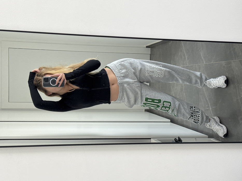 A full-body mirror selfie depicts a person, appearing to be a young adult female with long blonde hair, standing in a room in the city of Ariel, Palestinian Territory. The individual wears a black long-sleeved, zippered crop top exposing the midriff, grey athletic sweatpants, and white sneakers. The sweatpants feature inverted green lettering on the left leg that reads "SCITLEC" (Celtics) and "NOTSOB" (Boston), with "NOISIVID CITNALTA" (Atlantic Division) in inverted white text below. The right leg displays inverted white lettering, partially visible as "ETAKS LLA 02" (20 All Skate). The person holds a smartphone with a circular magnetic accessory in their right hand, obscuring their face, while their left hand is positioned in their hair above their head. The individual stands on a dark grey tiled floor, and the background behind the mirror consists of light-colored walls or doors, framed by a thin black mirror edge.