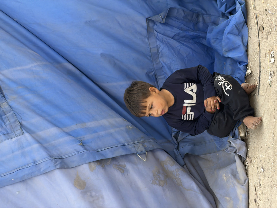 A young child, appearing male, with short dark hair and dark eyes, sits cross-legged on dry, light brown earth. He wears a navy blue long-sleeved shirt with a white and red "FILA" logo, and black track pants featuring a white Disney character logo on the left knee. His fingernails are painted red. Dirt is visible around his mouth and chin, and his feet are bare. He gazes towards the left side of the frame with a neutral expression. Behind him is a large blue tarp or tent material, faded and stained with dirt, consistent with a temporary shelter. The scene is situated in Gaza City, Palestinian Territory.