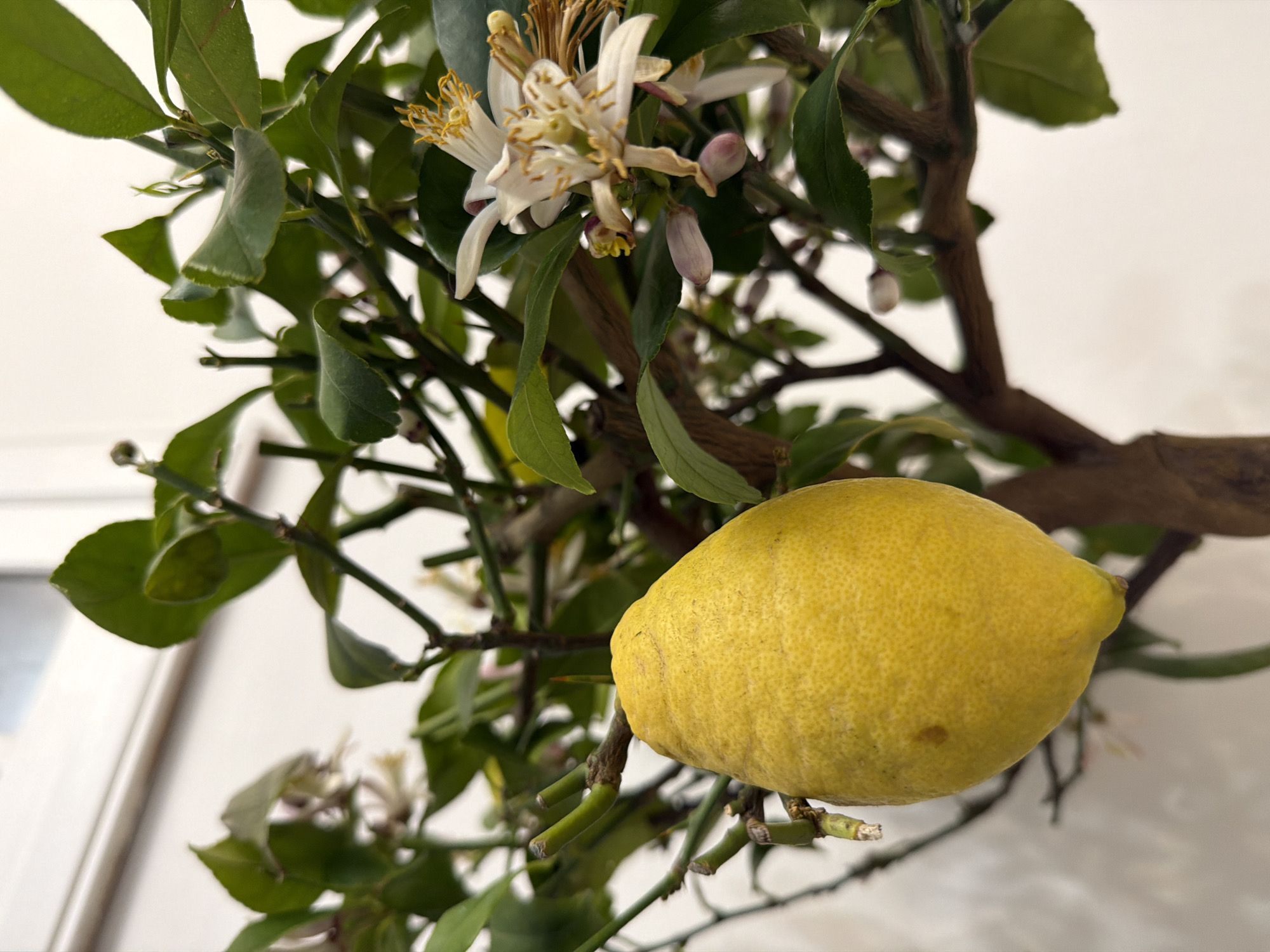 A close-up shot shows a lemon tree in bloom. A mature, yellow lemon hangs prominently on the branch. Several blossoms, some open and others still in bud, are visible among the green leaves. The tree's branches have a rough texture. The background is blurred, with hints of white walls and window frames, suggesting an indoor setting. There are no people visible in the image. The location in Plovdiv, Bulgaria is unknown.