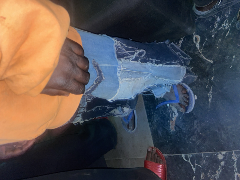 A person with dark skin sits wearing an orange sweater, black pants, and patchwork denim jeans. Their feet are clad in different colored flip-flops: one blue, one red. The setting appears to be indoors, possibly a home or public space, with a dark couch visible in the background and a marble-like floor. The image is rotated, presenting an unconventional perspective.