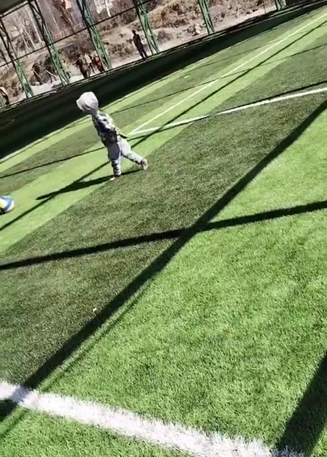 A child wearing a hooded jacket, jeans, and sneakers is shown tripping and falling while attempting to kick a blue and yellow soccer ball on a green turf field. The child slides a short distance. The field is enclosed by a fence and a metal structure that casts shadows on the field. A white line marking the boundary of the field is visible. In the background, there are several other people standing or walking. The video is shot from an elevated position.