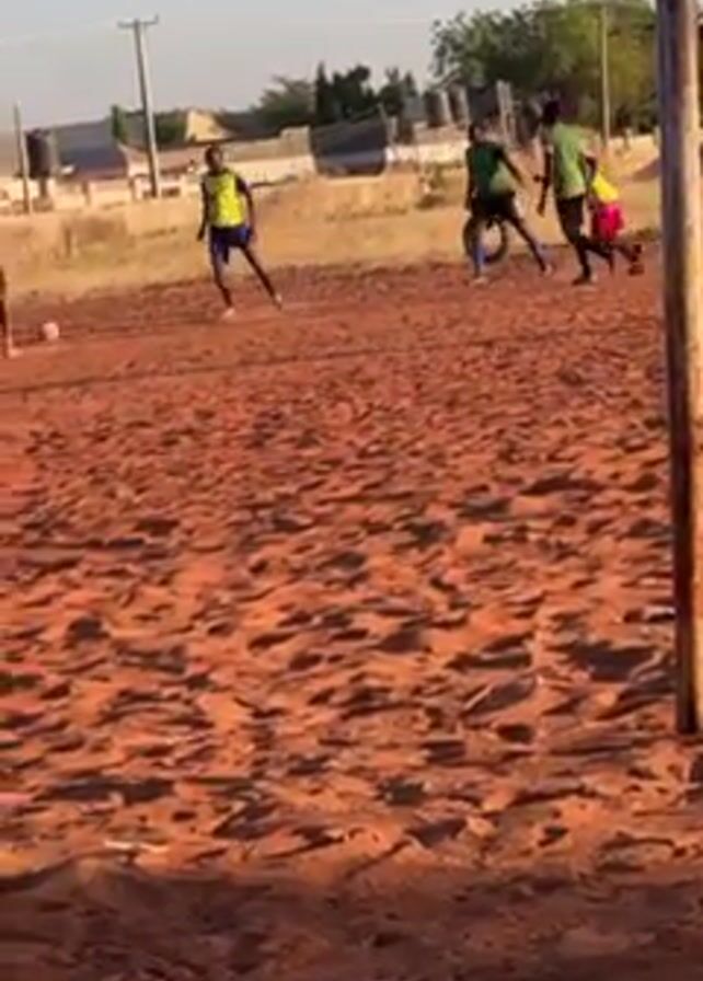 group of young men playing soccer on a dirt field. The field is red dirt with patches of sand. There are buildings, trees, and power lines in the background. One player wearing a blue shirt and yellow vest dribbles the ball as other players run around him. The players are mostly wearing dark shorts and yellow vests. There is a tire hanging near the edge of the field. The camera is positioned near a metal goal post.