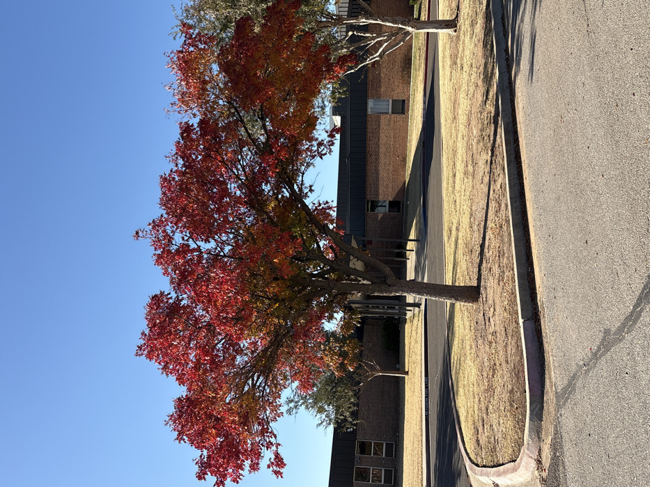 The scene depicts an outdoor view in Oklahoma City, United States, featuring a building and autumn trees under a clear blue sky. In the foreground, an asphalt paved surface, likely a driveway or parking lot, curves to the left, bordered by a concrete curb. This curb separates the pavement from an area of dry, light brown grass. A prominent deciduous tree with dense, bright red-orange fall foliage stands centrally in the midground, its trunk having rough, grayish-brown bark. Behind this tree and slightly to the left, a smaller tree with greenish-brown leaves is visible. To the right, another deciduous tree displaying similar red-orange autumn leaves is partially framed. The background is dominated by a single-story institutional building constructed with reddish-brown bricks. The building features multiple rectangular windows with dark frames and a dark-colored, flat or low-slope roof. A covered entrance or walkway extends from the building's facade towards the center-left. The upper portion of the image shows a clear, cloudless blue sky. No individuals, animals, or specific actions are present within the frame. Shadows are cast on the ground, indicating natural daylight conditions.