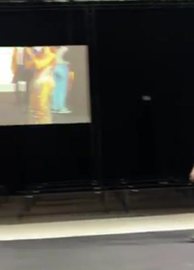 A video shows a fashion show. First, a woman in lingerie walks down the runway. The camera then looks up at the ceiling, showing lights and metal structures, before returning to the runway. Another woman, this time in a sparkling, sheer gown, walks down the runway, taking a selfie. A group of people stand to the side, observing. The environment appears to be a large warehouse or event space.