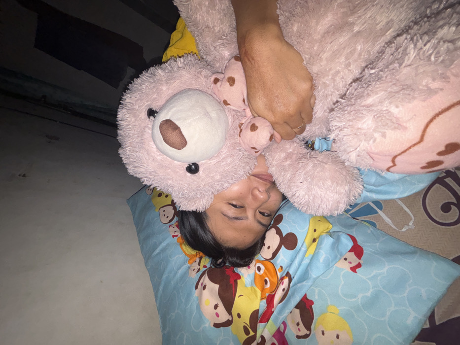 - "A woman lies on a blue pillow with cartoon characters, hugging a large pink teddy bear" by FM-pZJkE3, licensed under CC BY 4.0