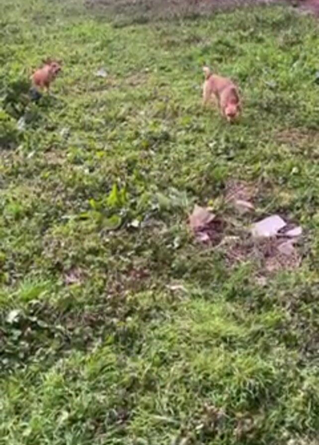 two small, tan dogs in a grassy area. One dog is closer to the camera and seems to be sniffing the ground. The other dog is further away. The grass is green but uneven, with patches of weeds and litter scattered throughout. In the background, there's a red brick building with visible windows and what appears to be a street with cars in the distance. The scene is somewhat overcast, and the lighting is muted. The camera appears to be handheld and slightly shaky.