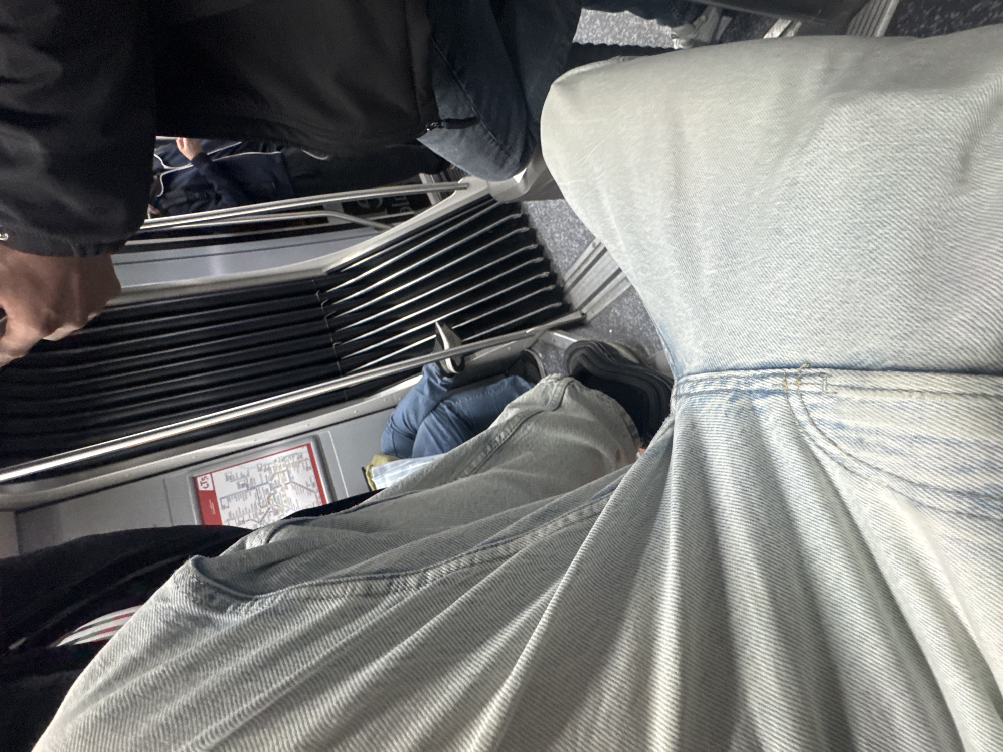 interior of a moving metro train. A person wearing light-wash jeans is seated on the left, taking up a significant portion of the frame. Another person, dressed in a dark jacket, stands to the left of the seated individual. A black horizontal slatted seat back runs across the middle of the image. Behind this is a map, attached to the wall, and other people are partially visible.