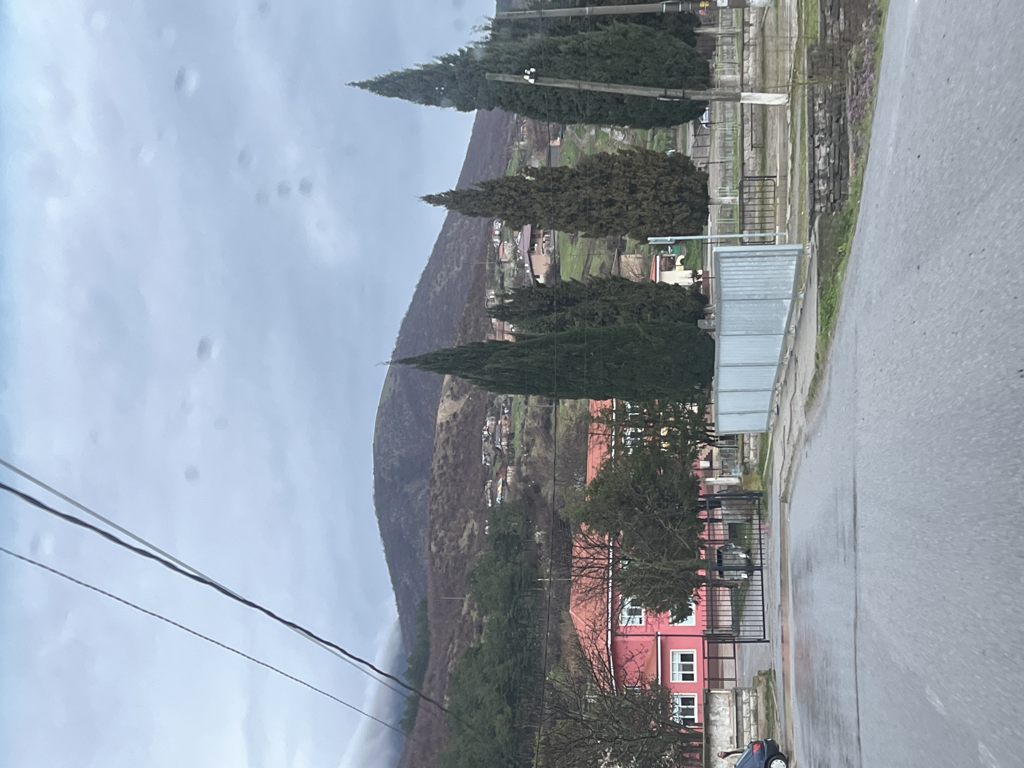 The image depicts a rural or semi-rural scene in Sotirya, Bulgaria, on an overcast day, likely observed from a vehicle on a wet asphalt road. In the immediate foreground, the perspective is from a wet, gray asphalt road that curves slightly to the right. Overhead, multiple dark utility wires traverse the cloudy, gray sky. To the left, a portion of a dark blue vehicle, possibly a sedan, is visible. Adjacent to the vehicle, a male individual stands facing right, wearing a light-colored jacket. To the right of the road, a silver corrugated metal barrier/fence, approximately waist-high, extends from the foreground towards the midground. Beyond this fence is a low stone wall and a patch of dry ground. The midground features a prominent two-story building with a distinctive reddish-pink exterior and white-framed rectangular windows, likely a public or institutional structure, situated behind a black metal gate. Several bare deciduous trees and dark green evergreen trees, some of which are tall and slender like cypresses, surround this building. To the right of the road, a line of these tall, narrow evergreen trees extends vertically, obscuring parts of the background. Wooden utility poles are interspersed among these trees. The background is dominated by a large, undulating hill or mountain covered with sparse, dry vegetation and some clusters of darker evergreen trees, suggesting a late autumn or winter season. Numerous small houses and other structures with varying roof colors are scattered across the lower slopes of the hill, indicating a residential area or village settlement. The sky is uniformly overcast with a light gray tone, and several circular lens flares or smudges are visible in the upper half of the image.