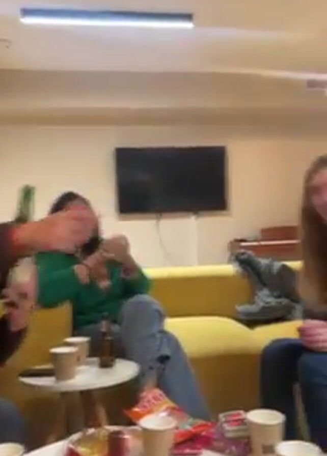 group of young women in a casual setting, seemingly a living room, having fun. One woman stands holding a wine bottle and pointing towards something off-camera, while the others react with laughter and excitement. The room contains a yellow couch, a coffee table with snacks and drinks, and a foosball table near a window. Overall, the scene depicts a lively and celebratory atmosphere.