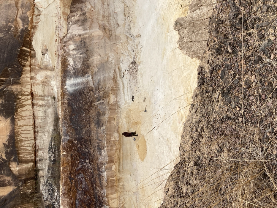 The scene depicts a deep, open-pit excavation or quarry in Nguzu Edda, Nigeria, viewed from an elevated position. The background features a tall, multi-layered cliff face exhibiting various strata of rock and sediment. The uppermost layers are dark brown with vertical dark streaks, transitioning to lighter beige and reddish-brown bands lower down. The working floor of the excavation is a wide, relatively flat area composed of light cream-colored sand or fine sediment. One individual, dressed in dark long-sleeved clothing, stands centrally on the light-colored floor, holding a shovel with its blade resting on the ground. To the left of the individual is a conical pile of light-colored, granular material, consistent with excavated sand or fine earth. Further to the right, near the base of the cliff, additional tools, possibly another shovel or pickaxe, and scattered debris are visible. The foreground consists of a steep, dark brown, rocky slope covered with small stones and sparse, dry, light-brown grasses, indicating the vantage point of the photographer. The overall environment suggests ongoing manual quarrying or mining operations.