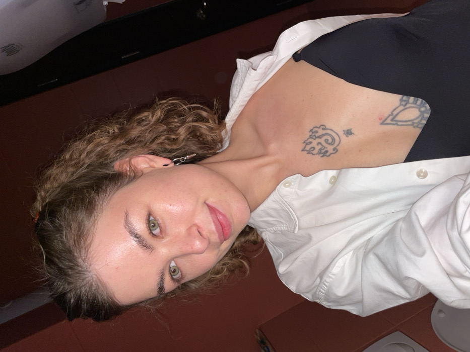 A woman with curly brown hair and green eyes is angled to the right, wearing a white button-up shirt over a black top. Two tattoos are visible on her upper chest, one appearing like a stylized cloud or dragon and the other, a geometric shape. She has light skin and wears an earring. The background is a dark red-brown color with furniture and a white toilet visible.