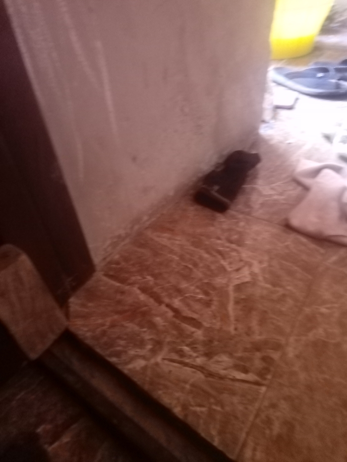 The scene depicts an interior corner within a structure in the city of Rangaza, Nigeria. The floor is composed of light brown ceramic tiles featuring white veining. A light-colored wall, exhibiting minor discoloration and texture, serves as the background. A dark brown door frame is partially visible on the left side of the image. On the tiled floor, near the base of the wall, a dark, rectangular object, consistent with a small electronic device or footwear, is positioned. To its immediate right lies a crumpled piece of white fabric. In the upper right portion of the frame, a yellow bucket and a pair of dark blue open-toed footwear are partially visible. A dark-colored door threshold is present on the floor in the foreground, with a light brown wooden block situated on its left. No individuals are depicted.