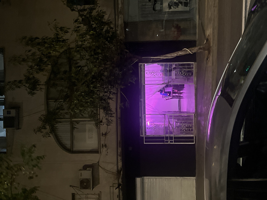 This nighttime image depicts a street scene in Haifa, Israel, focusing on a ground-floor establishment under a multi-story building. The establishment's entrance, framed by opened, ornate metal security gates, emits a prominent magenta/purple light. Inside, white translucent curtains are draped, and a lone individual wearing a blue shirt is seated at a high-top table with stools, visible towards the left side of the illuminated interior. Directly to the left of this entrance, a white roll-down shutter is closed. The building's upper floor, constructed from light-colored material, features a large arched window with white blinds and two external air conditioning units mounted on the facade. A tree with dark foliage stands in front of the establishment, its trunk partially visible with a white cable wrapped around it. In the immediate foreground, the hood and windshield of a silver/grey vehicle are visible, reflecting the purple light from the establishment. The overall scene is dimly lit by ambient sources, contrasting with the vibrant internal illumination of the ground-floor space.