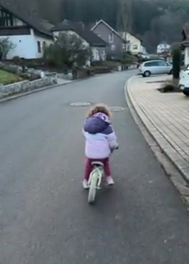 A young child is riding a balance bike down a slightly sloped paved road in a residential area. The child is wearing a light purple and white jacket with a dark purple hood, pink pants, and white sneakers. They have curly hair. The bike appears to be white or light-colored. The road has a sidewalk on the right side, with houses and trees visible in the background. The sky is overcast. There are cars parked on the side of the road and manhole covers on the road. The camera follows the child as they move down the street.