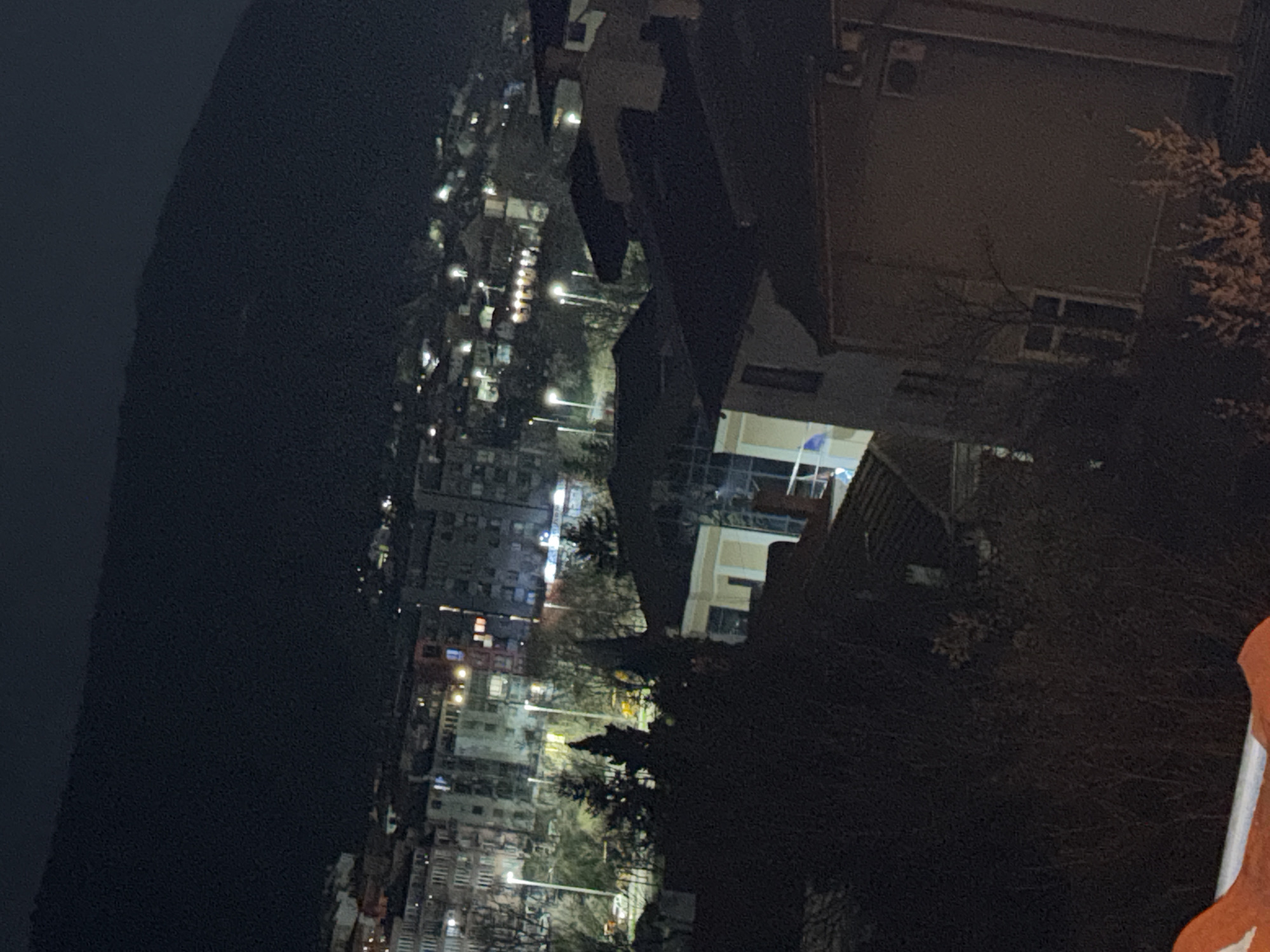 The image depicts a night scene in Shumen, Bulgaria. From a high vantage point, a view of the city unfolds, revealing residential buildings illuminated by streetlights and apartment windows. In the distance, a dark mass suggests a hill or mountain bordering the city. Closer to the viewer, the image captures buildings and trees, obscuring a more detailed view of the immediate foreground.