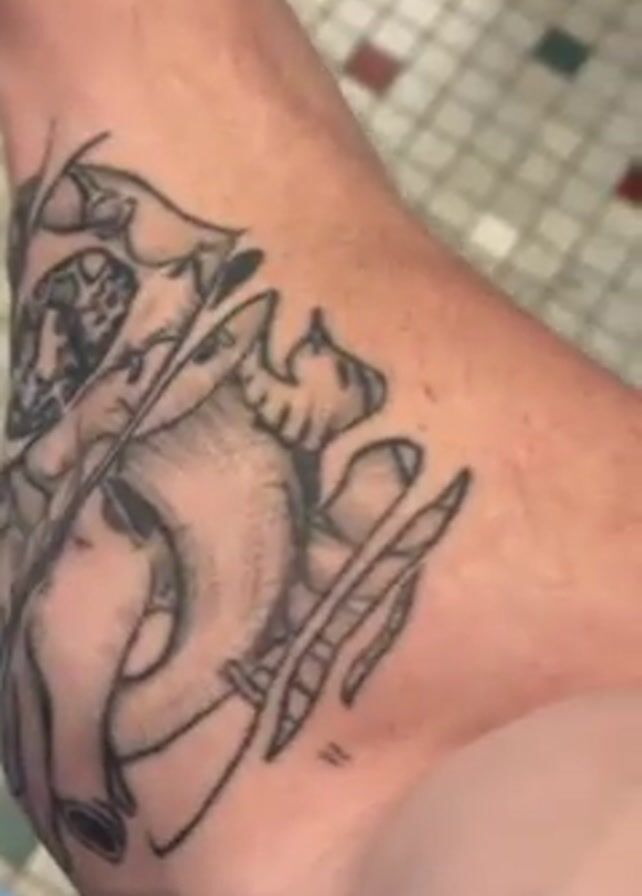 man's arm with a tattoo on his forearm. The tattoo is a detailed, black and white design that appears to depict an anatomical heart being revealed from under a layer of torn skin. The background is a tiled floor with squares of various colors, including red, yellow, green, and blue. Other people can be seen walking by in the background, wearing green pants and sneakers. The camera is fairly still, with minor movements to keep the tattoo in focus.