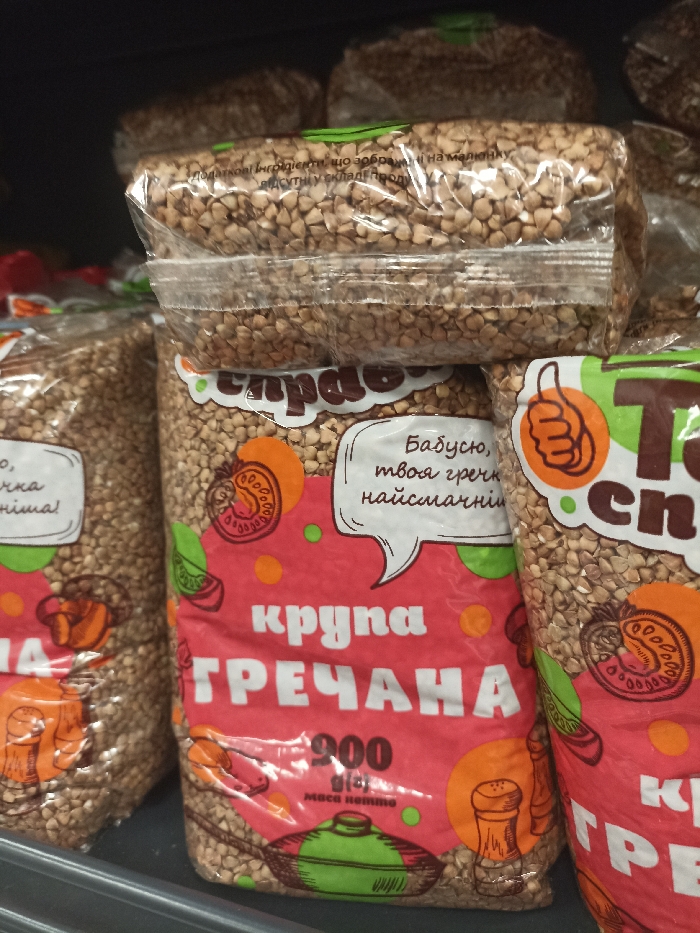 - "A close-up shows bags of buckwheat groats, labeled "krupa GRECHANA" in bold, white Cyrillic letters on a red background" by FM-7wfYm1, licensed under CC BY 4.0