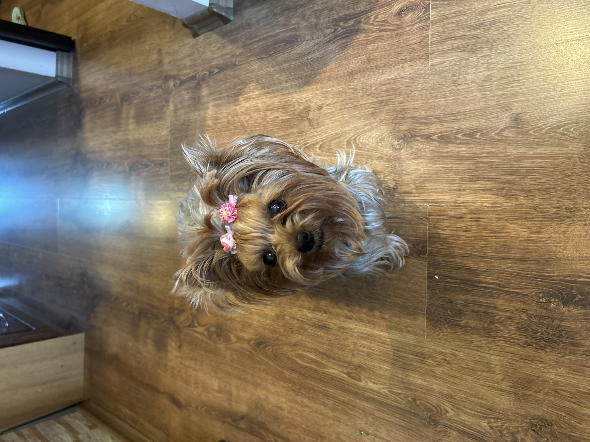 - "The image depicts a small, tan and gray Yorkshire Terrier dog with pink floral bows in its hair" by FM-n592m2, licensed under CC BY 4.0