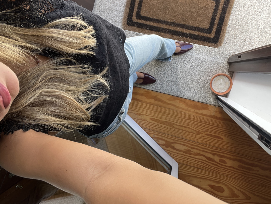 A high-angle image depicts a standing individual in an indoor entryway in Oliveira de Frades, Portugal. The subject, viewed from the mouth down, has light blonde hair, pink-toned lips, and fair skin. They are wearing a black top with lace detailing, light blue jeans, and dark red T-strap flat shoes. The left arm is raised and extends into the upper left quadrant of the frame. The floor features a light-toned wooden section with a visible grain on the left, separated by a white-framed threshold from a speckled light gray floor covering the right half of the image. A brown doormat with a dark rectangular border is positioned on the far right of the speckled floor. A small, unlit, round candle in a terracotta holder rests on the speckled floor near the base of the white frame.