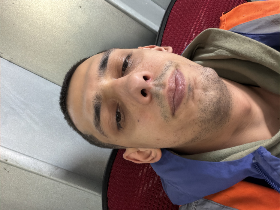 The scene is a close-up, upward-angle selfie of an adult male, located in the city of London, United Kingdom. The subject possesses short, dark hair, dark eyes, and light facial stubble. He is dressed in an olive-green hooded garment layered beneath an outer jacket. The jacket exhibits a blue panel across the upper chest and shoulders, with a prominent bright orange section partially visible on the right side. A zipper pull is present on the blue garment section. The background features a blurred, reddish, woven or upholstered surface situated behind the subject's left and right shoulders, indicative of a seat. Above this, a light grey, paneled ceiling or upper wall with visible seams and a gentle curve is observed. The male subject directly faces the camera with a neutral expression. No other individuals or interactions are depicted within the frame.