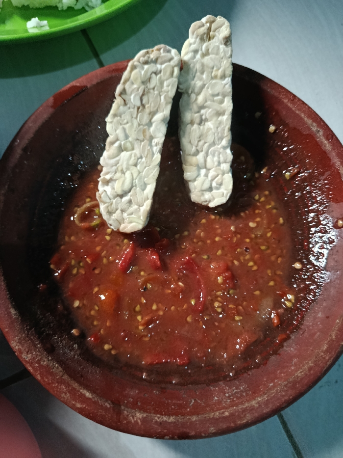An overhead forensic view depicts a reddish-brown unglazed clay mortar, commonly known as a cobek, situated in Kedung Dowo, Indonesia. The mortar contains a vibrant red, moist condiment, identified as sambal, which exhibits visible crushed red chili pieces and numerous small, light-colored seeds. Positioned diagonally within the sambal are two elongated pieces of light beige tempeh, showcasing the characteristic texture of fermented soybeans. A segment of a bright green plastic plate or bowl containing white rice is partially visible in the upper left background. The underlying surface appears to be a light-colored, possibly tiled, countertop or floor. No individuals are present in the scene.