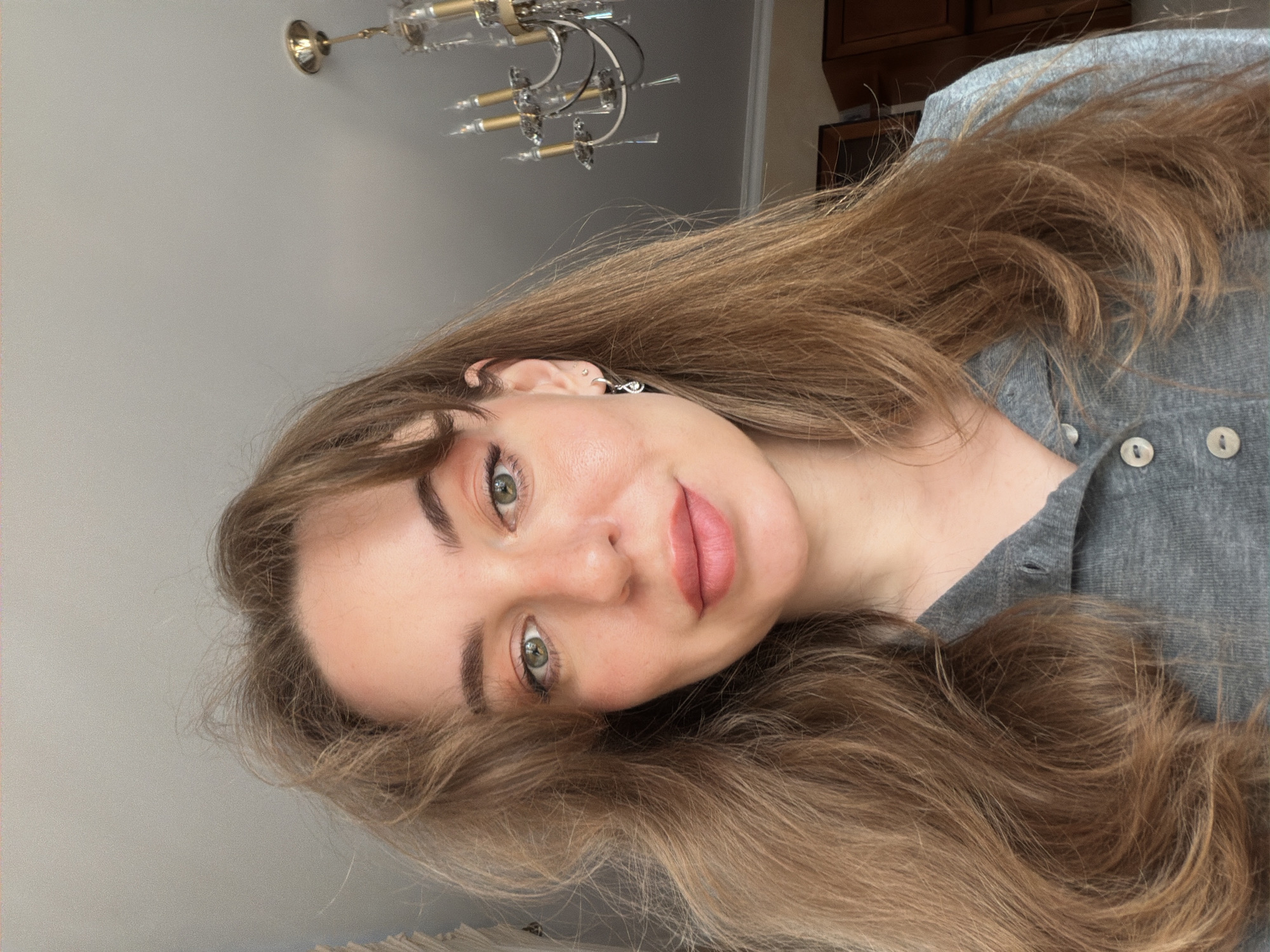 A light-skinned young woman with hazel eyes and long, light brown hair is seen in a close-up portrait. She is wearing a gray, button-up shirt. The background includes a light gray wall and a portion of a chandelier. Given that no further information is provided in the image, there is no indication that it was taken in Khimki, Russia or any other location.