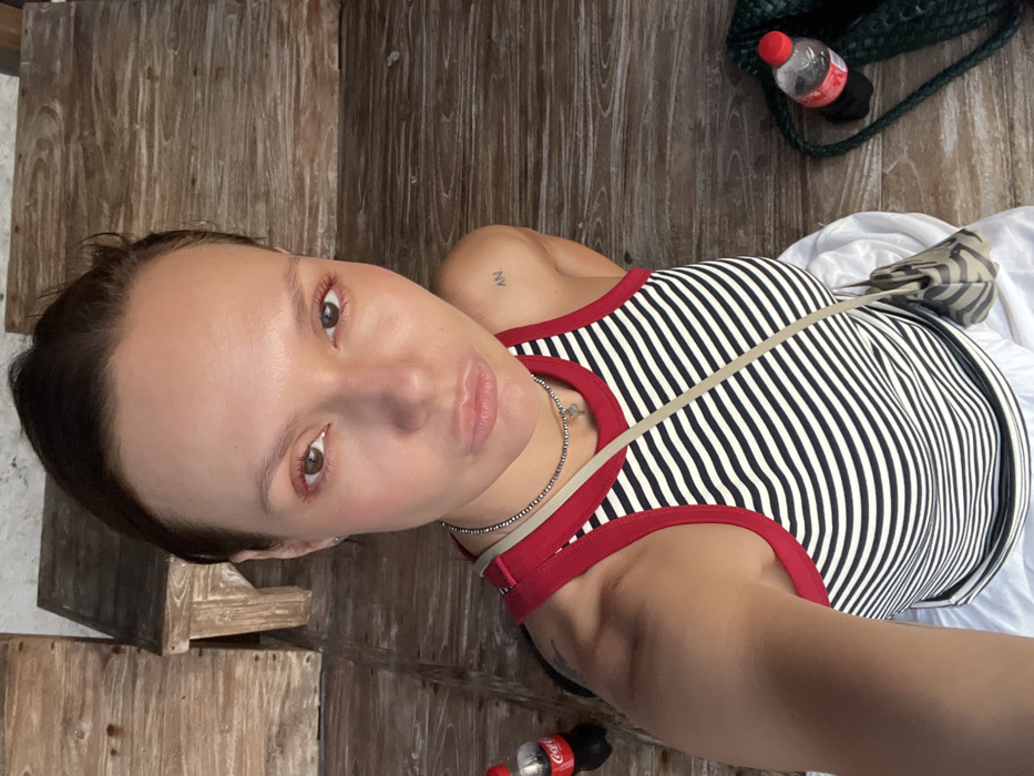 A high-angle photograph captures an adult female posing for a selfie in Pecatu, Indonesia. She is positioned against a background of light-colored, rustic wooden planks that form both a floor and what appear to be two low benches or tables behind her on the left. The female subject has dark hair pulled back from her face and a tanned complexion. She looks directly into the camera with a slight pout. Her eyes are brown, and a reddish hue is present around her eyelids. She wears a sleeveless tank top with horizontal black and white stripes, accented with red trim around the neckline and armholes. A small, silver-colored beaded necklace with a cross pendant is visible on her neck. A small light-colored shoulder bag with a patterned strap is worn across her body, resting on her midsection. Her lower garment, partially visible, appears to be white fabric. A small tattoo with the letters "AN" is visible on her upper left shoulder, and another dark, less distinct tattoo is on her left bicep. To the left of the subject, a partially consumed plastic bottle of Coca-Cola with a red label and black cap rests on the wooden floor. Another identical Coca-Cola bottle and a dark green woven bag are visible on the wooden surface to the far right of the frame. The scene is illuminated by natural light.