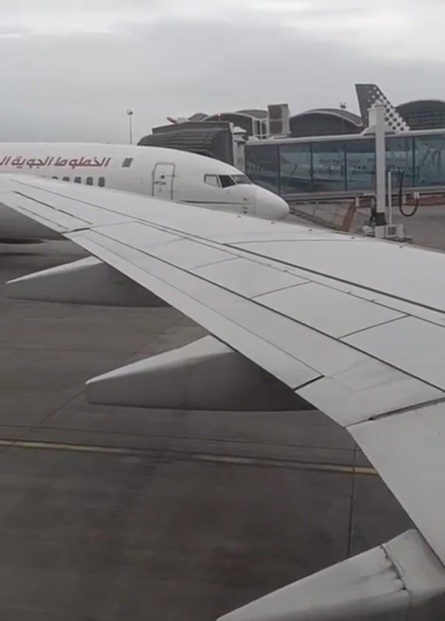 view from the wing of an airplane, with another plane parked on the tarmac nearby. The parked plane is an Air Algérie Boeing 737, painted white with red accents. The engine is visible, and the registration number on the tail is 7T-VKJ. In the background, there is a covered walkway connecting the terminal to the aircraft. The weather appears overcast, and the tarmac is a gray concrete surface. The video appears to have been taken from inside the airplane, at a gate.