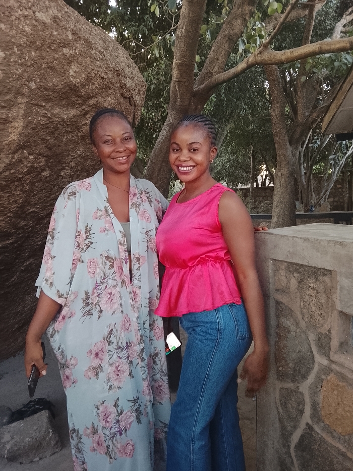 The image depicts two adult Nigerian females posing outdoors in a natural, park-like environment within Jos, Nigeria