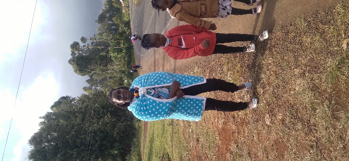 Three individuals stand on a path next to a grassy area. The person in the foreground wears a light blue wrap with white polka dots and a white trim. Behind her, a child in a red sweater stands on the path. A third person, likely a child, stands partially visible behind the second child, wearing a brown jacket. Trees and a cloudy sky appear in the background.