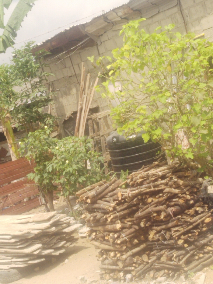 The scene depicts an outdoor area in Lekki, Nigeria, under daylight conditions. In the background, an unpainted concrete block building with a corrugated metal roof is visible. Several long, slender wooden poles lean against the building's wall. The left foreground shows a stack of flat, light-colored wooden planks resting on sandy ground, partially supported by a dark tire. Adjacent to these planks, a small tree with green foliage and yellow-green fruits is present, with a larger tree featuring broad green leaves behind it. A brown wooden fence or gate structure is partially discernible behind these trees. The right foreground contains a large, prominent pile of debarked firewood, composed of numerous short logs bundled together with light-colored string. Behind this firewood, a black cylindrical water storage tank is situated, partially obscured by green foliage from a tree on the far right. No individuals are depicted, and no actions or interactions are occurring.