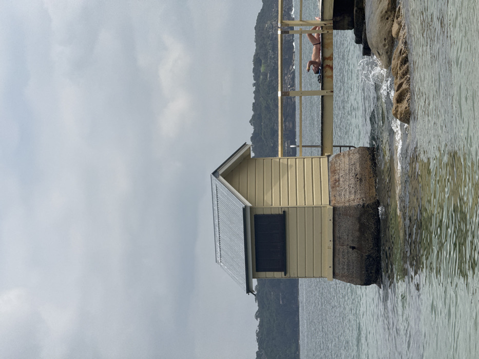 This image depicts a coastal scene in Watsons Bay, Australia, under a uniformly overcast sky. A single-story building, clad in light yellow horizontal timber, features a dark grey corrugated metal gabled roof and a dark, shuttered window on its visible facade. This building rests on a robust concrete plinth situated in the water. A light yellow wooden pier, equipped with railings, extends from the right side of the frame, connecting to the building's foundation. A sole individual, an adult male, is positioned supine on the pier's wooden deck, clad in dark swimming briefs. His right arm is flexed with the hand near his head, and dark footwear or accessories are present beside him. The surrounding water is relatively calm, displaying ripples and small waves breaking against the pier's support and exposed natural rock formations in the foreground. A distant, heavily vegetated landmass forms the background across the body of water.
