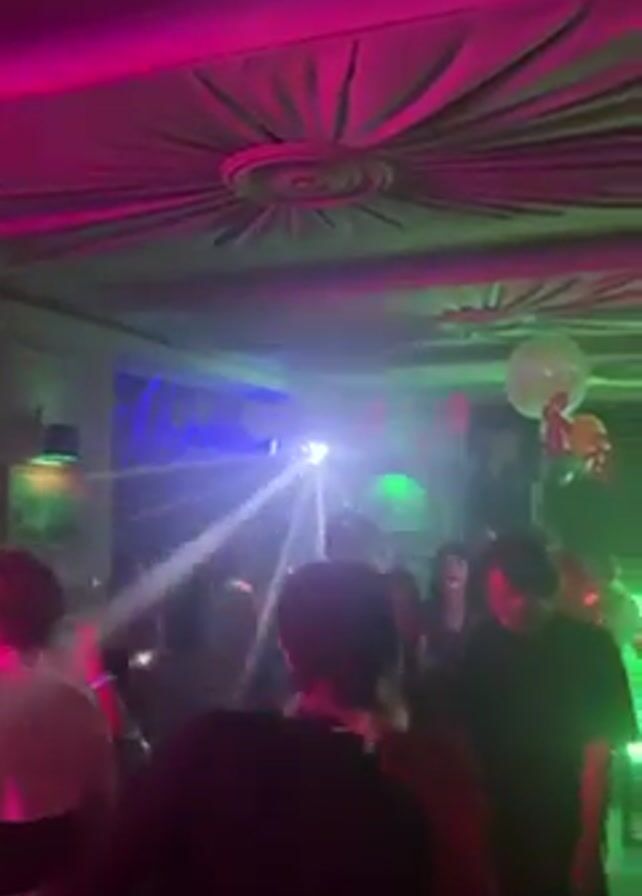 room decorated with party lights, pink and green ceiling lights, and balloons. People are dancing in a crowd, but their faces are not clearly visible. A laser light is shining through the crowd.