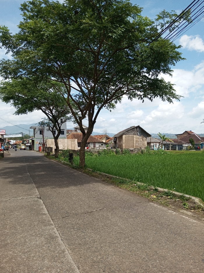 This image depicts a semi-urban street scene located in the city of Ariyalai, Sri Lanka. A two-lane paved road, appearing worn, extends from the foreground towards the distant horizon. On the left side of the road, multiple mature trees with dense green canopies line the edge, casting shadows on the asphalt. Beyond these trees, various buildings are visible, including a multi-story structure and one with a red and white commercial sign, partially legible as "INDOMARET," further down the street. Distant vehicles, including motorcycles and a light-colored car, are present on the road, indicating active traffic. On the right side of the road, a lush green field, consistent with a rice paddy, stretches from the foreground into the midground, separated from the road by a low concrete curb. Beyond the field, a collection of residential buildings with assorted roof types, including red tiles and darker corrugated material, are visible. The background features a range of mountains beneath a partly cloudy blue sky, with dark utility wires spanning the upper right portion of the frame. No individuals are distinctly identifiable in the immediate foreground.