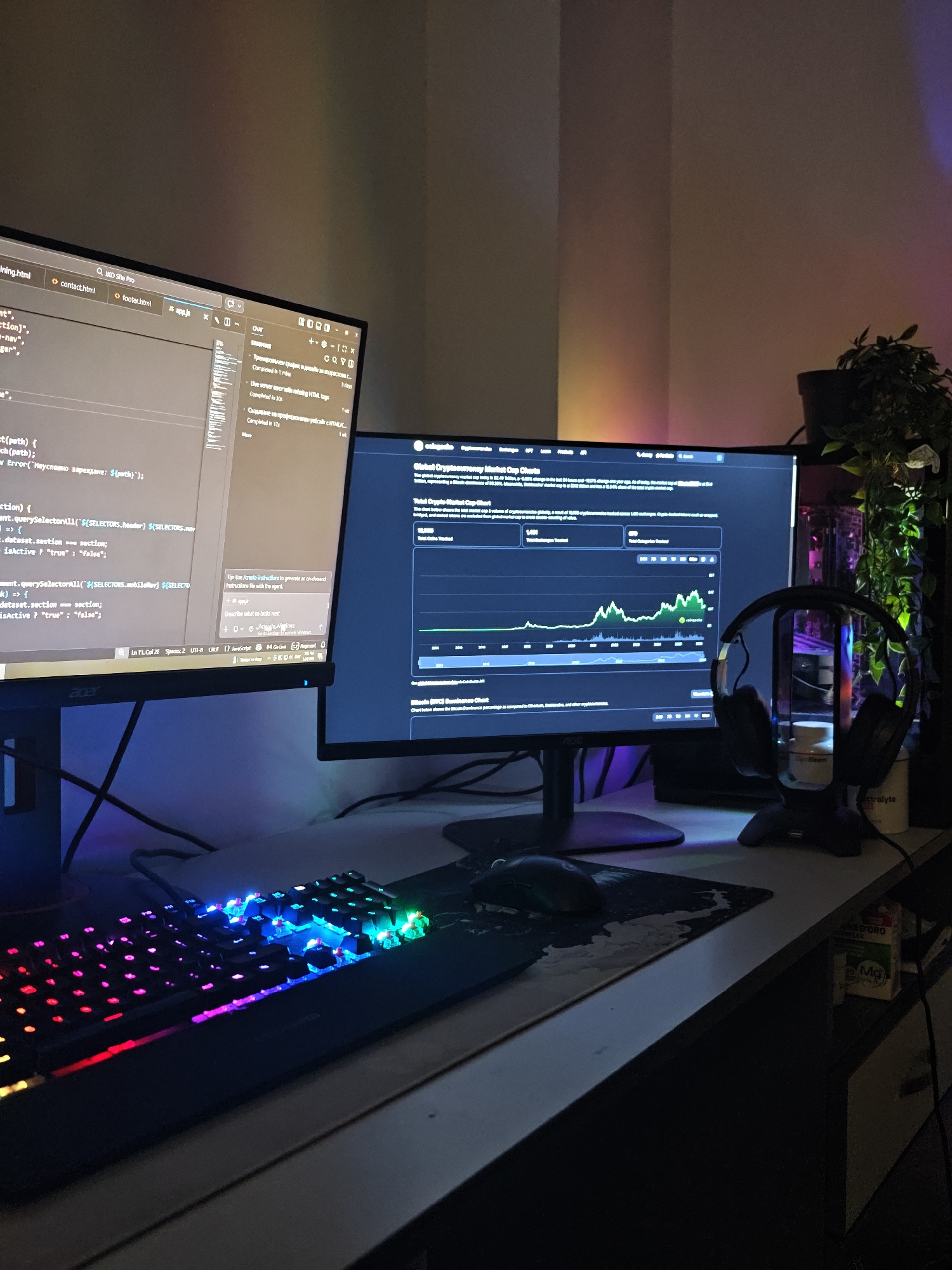The image depicts a dimly lit indoor computer workstation located in Kozloduy, Bulgaria. No individuals are present. The scene features two computer monitors on a light-colored desk. The left monitor, an Acer, is oriented vertically and displays a code editor with tabs for HTML and JavaScript files, including a visible chat overlay with messages in Bulgarian and English, indicating development work. The right monitor, an AOC, is horizontally oriented and displays a webpage titled "Global Cryptocurrency Market Cap Charts," showing a line graph of market cap data. In front of the left monitor, a mechanical gaming keyboard with multi-color RGB backlighting is visible. A black gaming mouse rests on a dark mousepad with a light-colored abstract design between the keyboard and the right monitor. To the right of the right monitor, a pair of black over-ear headphones sits on a stand, adjacent to a white jar labeled "Iron Bean" and a white cup labeled "Electrolyte." A green potted plant with trailing vines is positioned on a shelf above the right side of the desk, illuminated by subtle ambient lighting. The environment is illuminated by the screens and RGB light strips, casting purple, blue, orange, and green hues onto the wall and surrounding objects. Below the right side of the desk, a cabinet is partially visible, on which a small white carton labeled "REDORO" and "Mg" is placed. The overall setup suggests a dedicated workspace for coding and cryptocurrency monitoring.