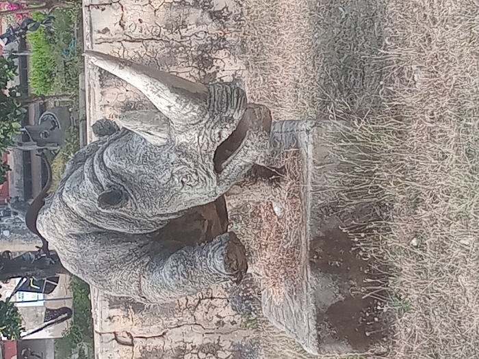 A stone rhinoceros sculpture sits on a cracked stone surface. Its head is turned to the side, and it has two prominent horns. The base and surrounding area are covered in dry grass and dirt. In the background, blurred greenery and structures suggest an outdoor or garden setting. The sculpture exhibits detailed texture, resembling the animal's hide.