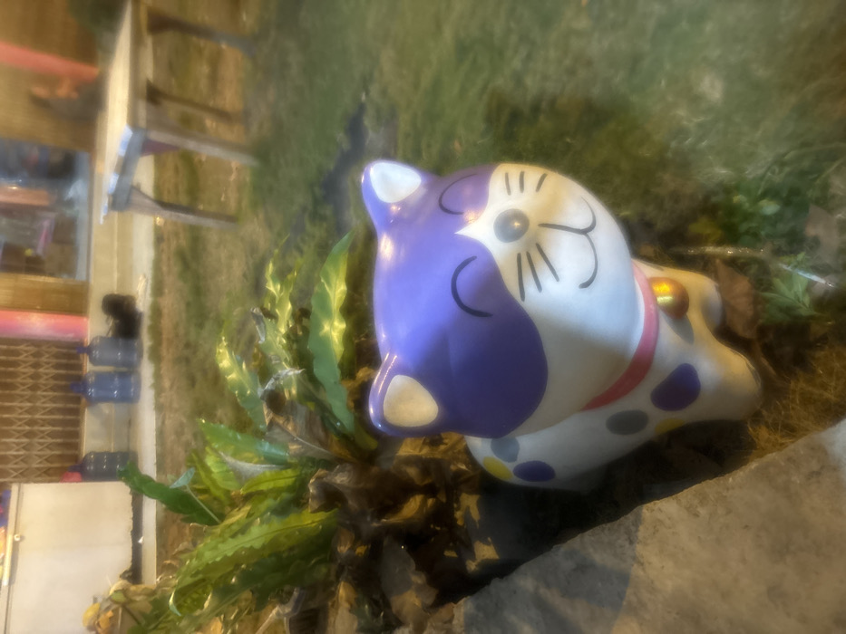- "A ceramic cat statue, painted with a two-tone pattern of white and purple, rests near green plants and a concrete edge" by FM-bmo3E3, licensed under CC BY 4.0