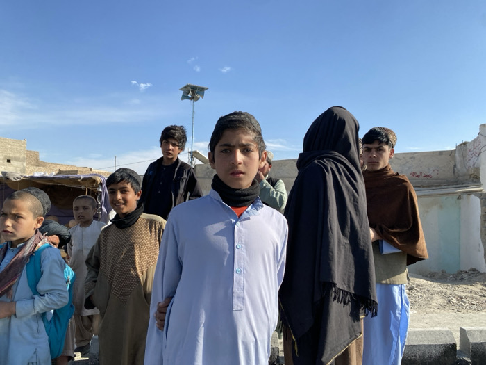 The image captures an outdoor scene in Gundigan Village, Afghanistan, under a clear blue sky with sparse clouds. The foreground and midground feature a group of approximately eight males, primarily boys and young men, facing generally towards the viewer. In the immediate foreground, a young male, likely a teenager, wears a light blue traditional garment over an orange undershirt and a black neck gaiter, looking directly at the camera with a neutral expression. His left arm is bent. To his left and slightly behind, a younger boy in a light brown patterned traditional garment and black neck gaiter smiles towards the camera. Further left, a younger boy in a light blue garment, wearing a dark cap and carrying a light blue backpack, looks slightly to his left. Behind them, another young boy in a light-colored traditional outfit maintains a neutral expression. To the right of the central foreground figure, a person dressed in a black full-body covering with fringed edges stands with their back largely to the camera, obscuring their face. To the far right, a young man wears a brown patterned cap, a brown shawl draped over his shoulders, and light blue traditional trousers, looking towards the camera. Other individuals are partially visible in the midground. The background reveals a village environment. On the left, simple, one-story structures, possibly constructed from mud-brick or concrete, are visible, one covered by a tarp or fabric awning. In the center-right background, a tall, slender pole with a solar panel mounted at the top and two loudspeakers is present. To the right, a white-painted wall with visible graffiti in Arabic script, including the discernible word "عبدال" (Abdal), marks the boundary of a structure. The ground appears to be unpaved, consistent with a dirt or gravel path. The scene is brightly lit by natural daylight.