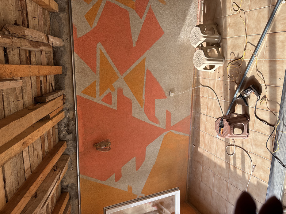 This image depicts an indoor or semi-enclosed space, possibly a balcony or terrace, in Stefan Karadja, Bulgaria, undergoing renovation or construction. The scene is brightly illuminated by natural sunlight casting strong shadows from the left. The ceiling consists of exposed wooden beams and planks, indicating an unfinished or rustic architectural style, with a narrow concrete or plaster band visible above the walls. A silver-colored metal trim strip runs horizontally along the wall-ceiling junction. The main wall features a textured surface, painted with an abstract geometric pattern using shades of orange, coral, and a light beige or grey. A white-framed window or door is partially visible on the far left. Centered higher on the patterned wall is a glass wall-mounted light fixture, unlit. Lower on the right side of the wall, a white electrical outlet is visible, from which a white extension cord extends across the floor. The floor is covered with light brown square ceramic tiles. Various items related to construction or repair are scattered across the tiled surface. On the left, a dark brown plastic stool holds a pair of pliers or wire cutters and another small tool. Adjacent to this stool, a black and grey power drill lies on the floor, along with tangled electrical wires in yellow, black, and white. A long, silver-colored metal pole or conduit rests horizontally across the mid-ground. Further to the right, two light beige or off-white plastic stools are positioned against the patterned wall. No individuals are present in the scene.