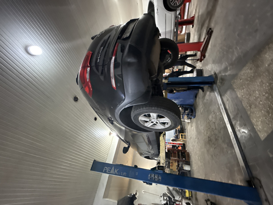 The image displays an interior view of an automotive service garage in Vagharshapat, Armenia. A dark-colored Kia Sportage SUV is positioned centrally, elevated on a blue two-post hydraulic vehicle lift, with its underside and wheels readily accessible. The lift's visible post bears "PEAK LIFT" branding. The vehicle's rear section, including taillights, the "SPORTAGE" emblem, and a dark bumper, is prominent. The front wheels have silver multi-spoke rims. The garage features a light-colored, possibly concrete, floor and a white, horizontally ribbed panel ceiling fitted with multiple illuminated oval-shaped light fixtures. In the right background, a white sedan or SUV is partially visible, elevated on a red two-post lift. At least two individuals, wearing dark clothing, are visible on the floor beneath the elevated Kia Sportage, appearing to be engaged in work around the vehicle's rear passenger side. Various equipment, including shelving with assorted items and at least one spare tire, are also visible on the garage floor and in the background.