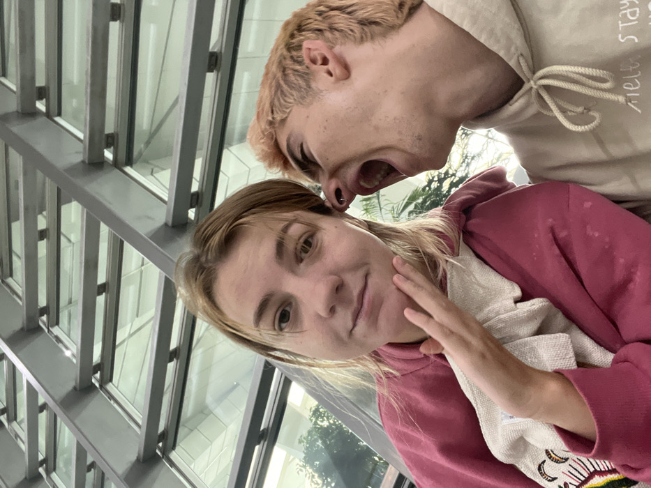 The image depicts two individuals within a modern indoor environment, consistent with an airport terminal such as Indira Gandhi International Airport in New Delhi, India, identifiable by the expansive glass and metal structural ceiling visible in the upper background. The person on the left is a female with light-colored hair, wearing a pink hooded sweatshirt exhibiting several lighter-colored marks and a cream-colored fabric sling or wrap visible on her left arm. She looks directly at the camera, her left hand resting below her chin. To her immediate right, a male with light orange hair and a nose ring in his left nostril is depicted with his mouth wide open in an exaggerated expression. He wears a light beige hooded sweatshirt with drawstrings and white embroidered text reading "FIELD STAY HOME" on the chest. Green foliage from interior plants is visible through the background glass panels.