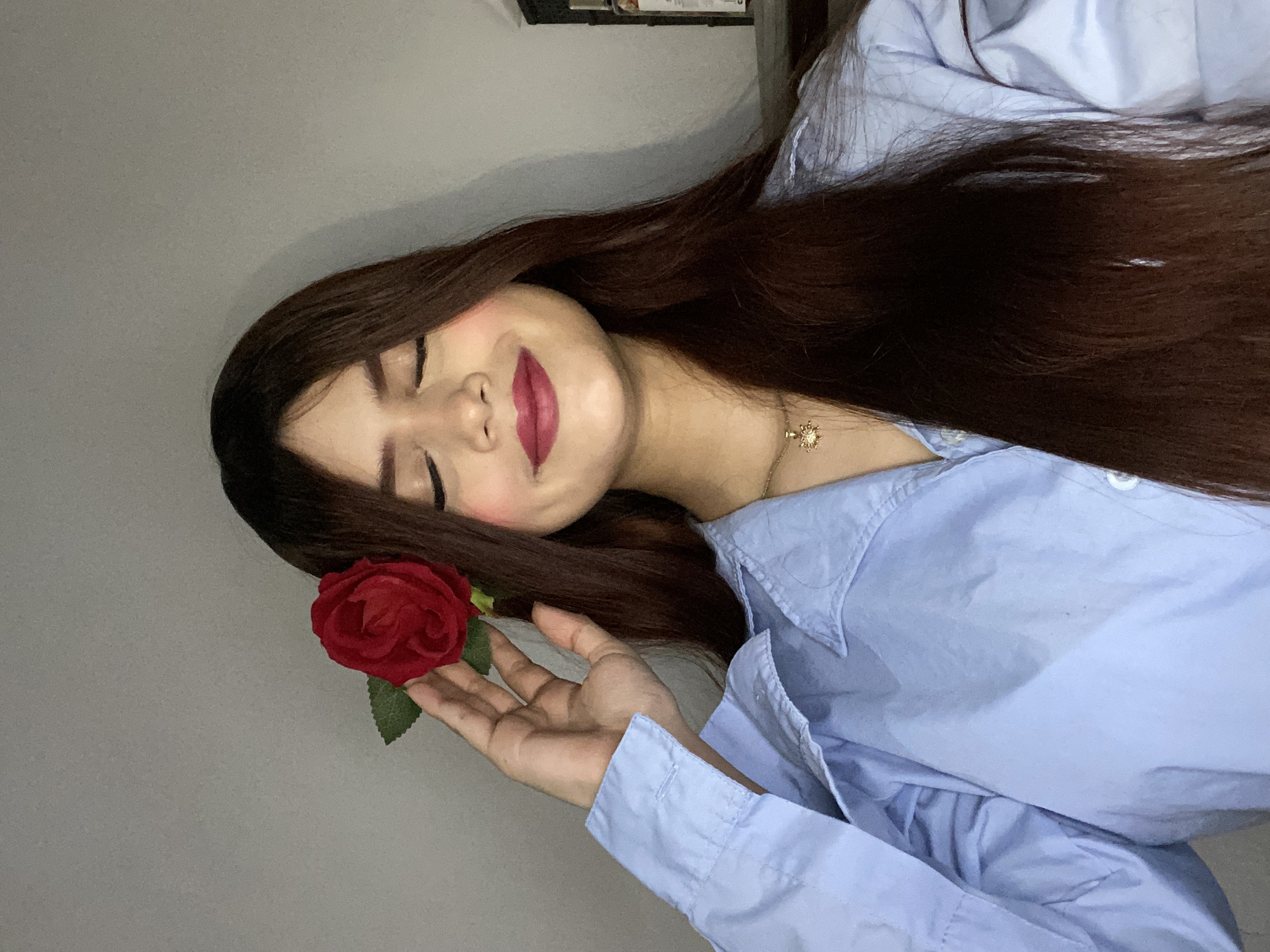 A woman with long, dark brown hair is posed in a semi-reclined position, wearing a light blue button-down shirt. Her eyes are closed and she is smiling slightly. She holds a red rose in her right hand. A gold necklace with a sun-shaped pendant is visible around her neck. The background is a plain gray wall. The location and city are not discernible from the image.