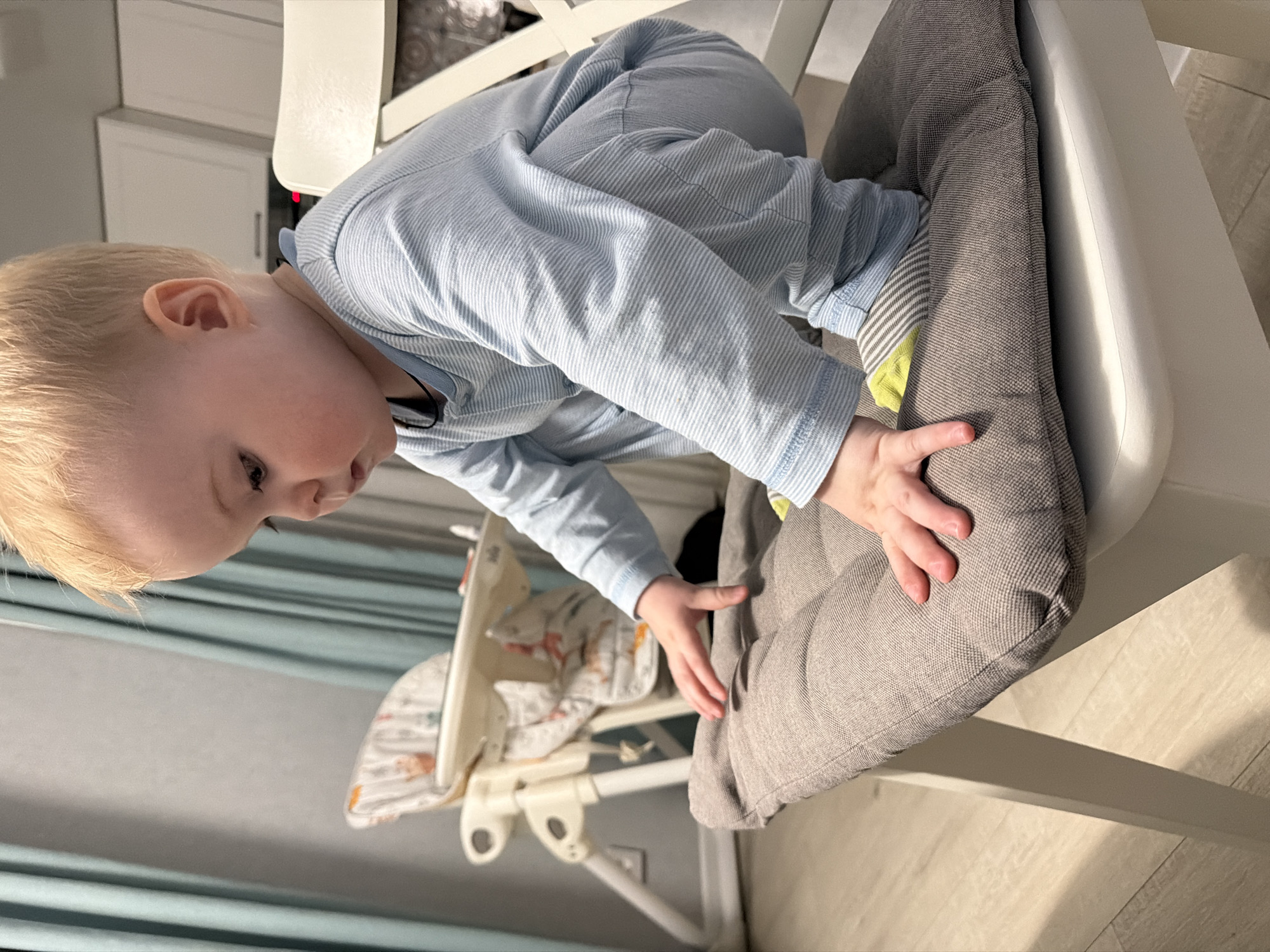 A young child with blond hair wearing a long-sleeved, light blue striped shirt is leaning over the side of a high chair