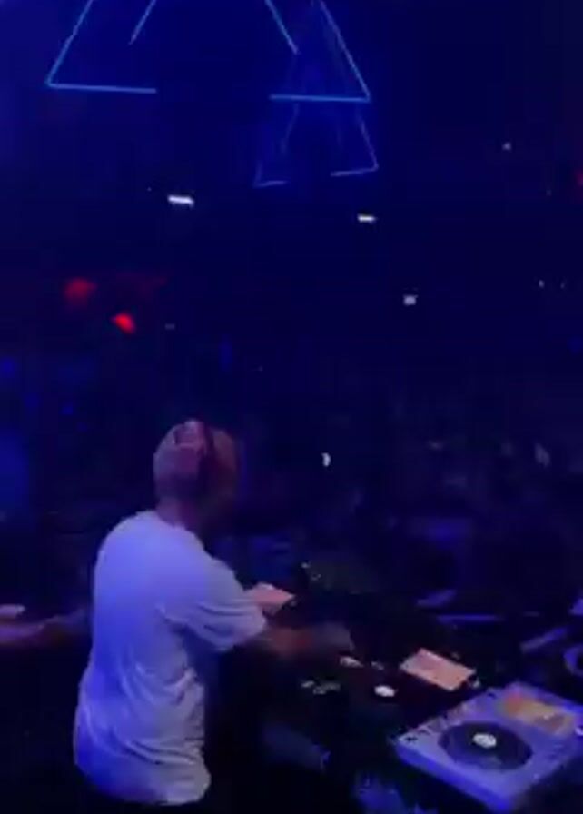 DJ performing at a crowded nightclub. The DJ, wearing a white t-shirt, is standing behind a mixing console with the logo "Glitterbox" on it. He is manipulating the controls while facing a large crowd of people who are dancing and cheering. The lighting is dynamic, shifting between white, purple, and red, and a fog machine adds to the atmosphere. The club has a high ceiling, and the overall ambiance is energetic and lively.