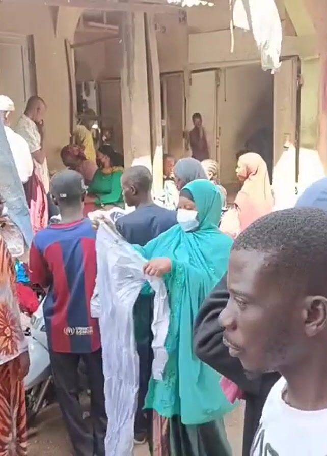 In a video captured at eye level, a group of people are gathered outside a building. The building appears to be a storefront or a residence with multiple entrances or open spaces. The crowd is composed of men, women, and children, many wearing traditional or casual clothing. Several women are wearing headscarves or hijabs. Some individuals are examining or holding clothing items, suggesting a market or distribution activity. A man in the background appears to be assisting or supervising. The overall atmosphere seems busy and possibly social, with people interacting and moving around. The environment suggests an urban or semi-urban setting, potentially a street or a marketplace in a developing country.
