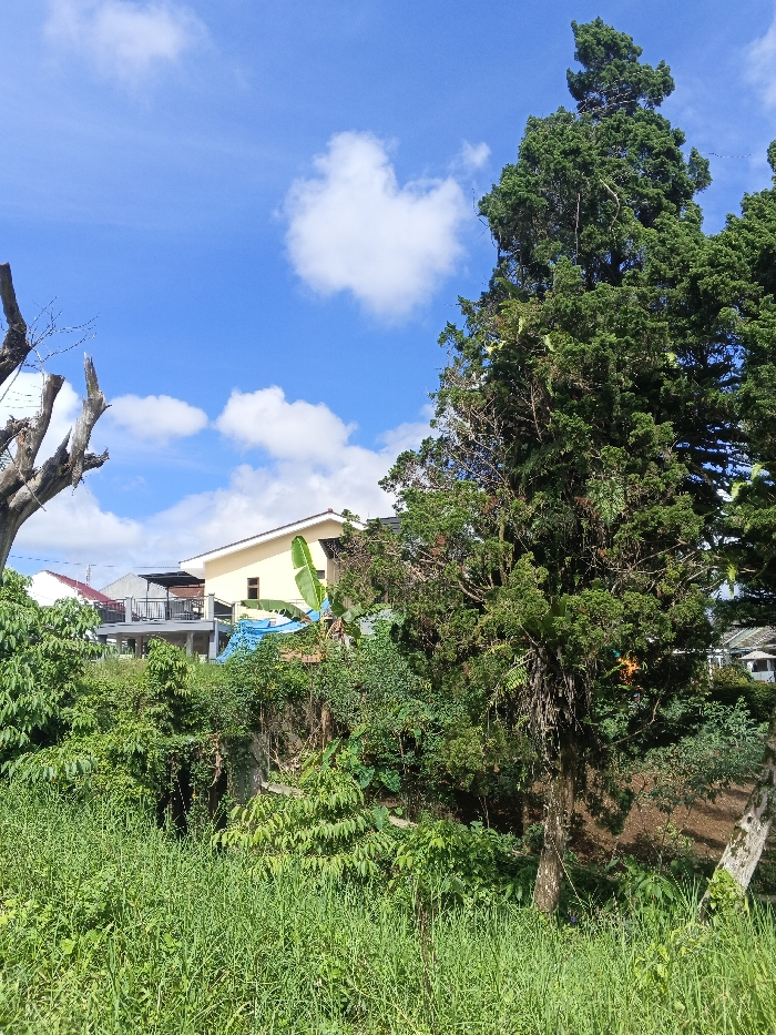 The image displays an outdoor scene in ឃុំ ផាត់សណ្ដាយ, Cambodia, under a bright blue sky with scattered white cumulus clouds. The foreground consists of dense, unkempt green grass and various shrubs. In the mid-ground, a mix of lush tropical vegetation, including broadleaf plants, banana-like leaves, and tangled vines, partially obscures the terrain. A prominent, tall, dark green coniferous-type tree stands on the right side of the frame, extending from the bottom to the top edge. On the far left, several bare, cut tree stumps are visible. In the background, a two-story residential building with a light cream-colored facade and a dark roof is partially visible through the foliage. This building features an open-air lower level with a dark railing. A blue tarp is draped below this structure, amidst the greenery. Another white-walled building with a dark roof is partially visible to the left of the cream-colored house. No people or active events are depicted.